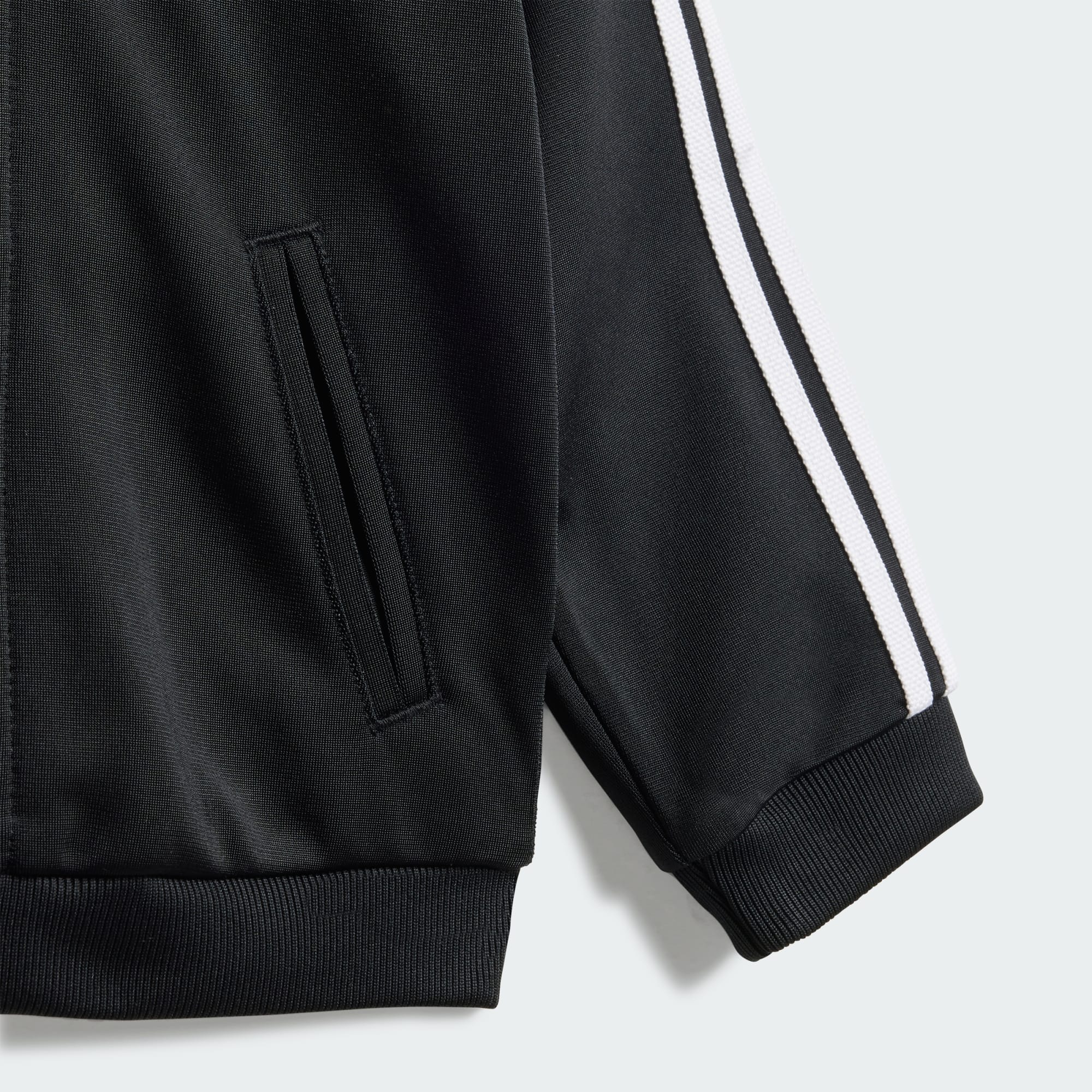 - Top: Full zip, stand-up collar; Bottom: Waistband with drawcord