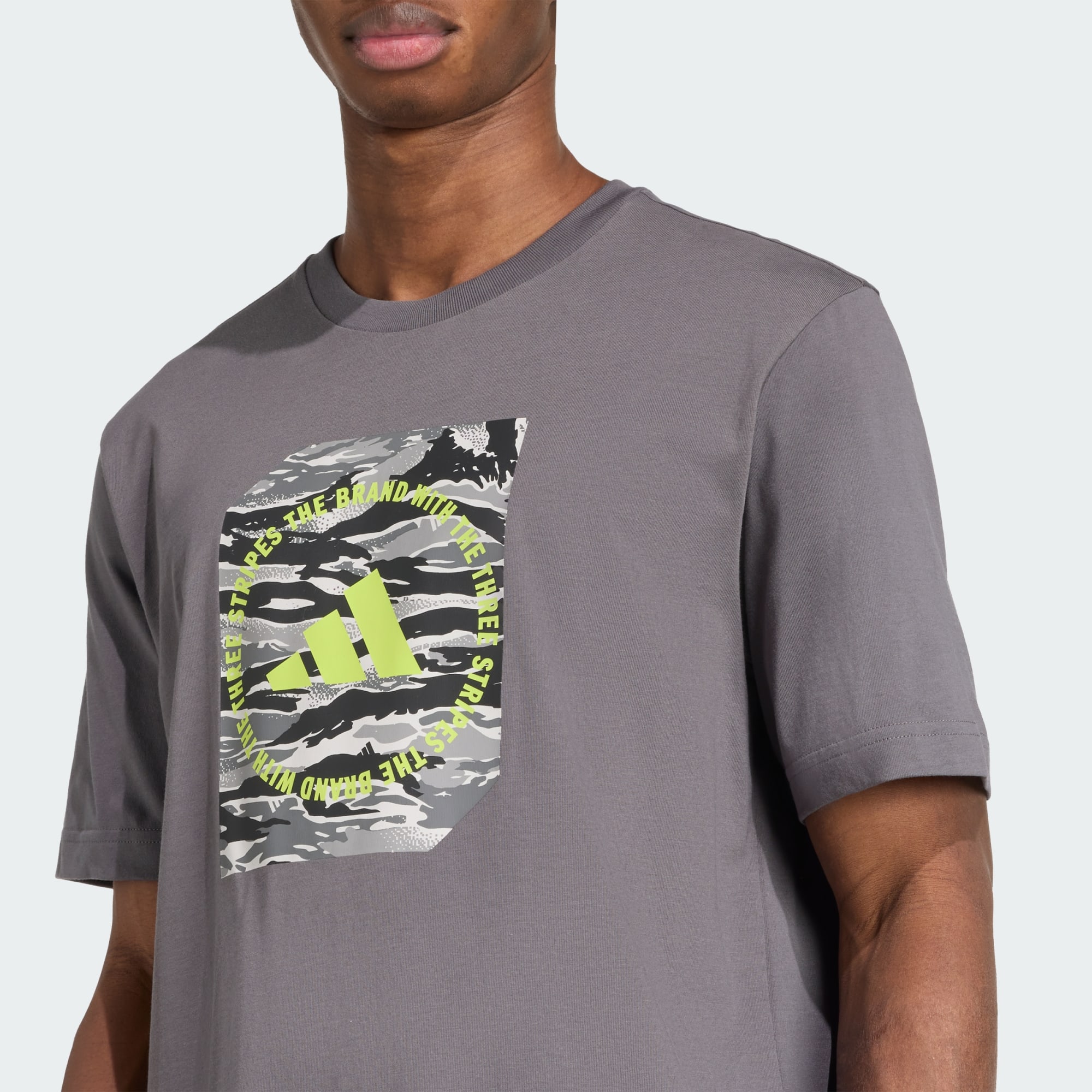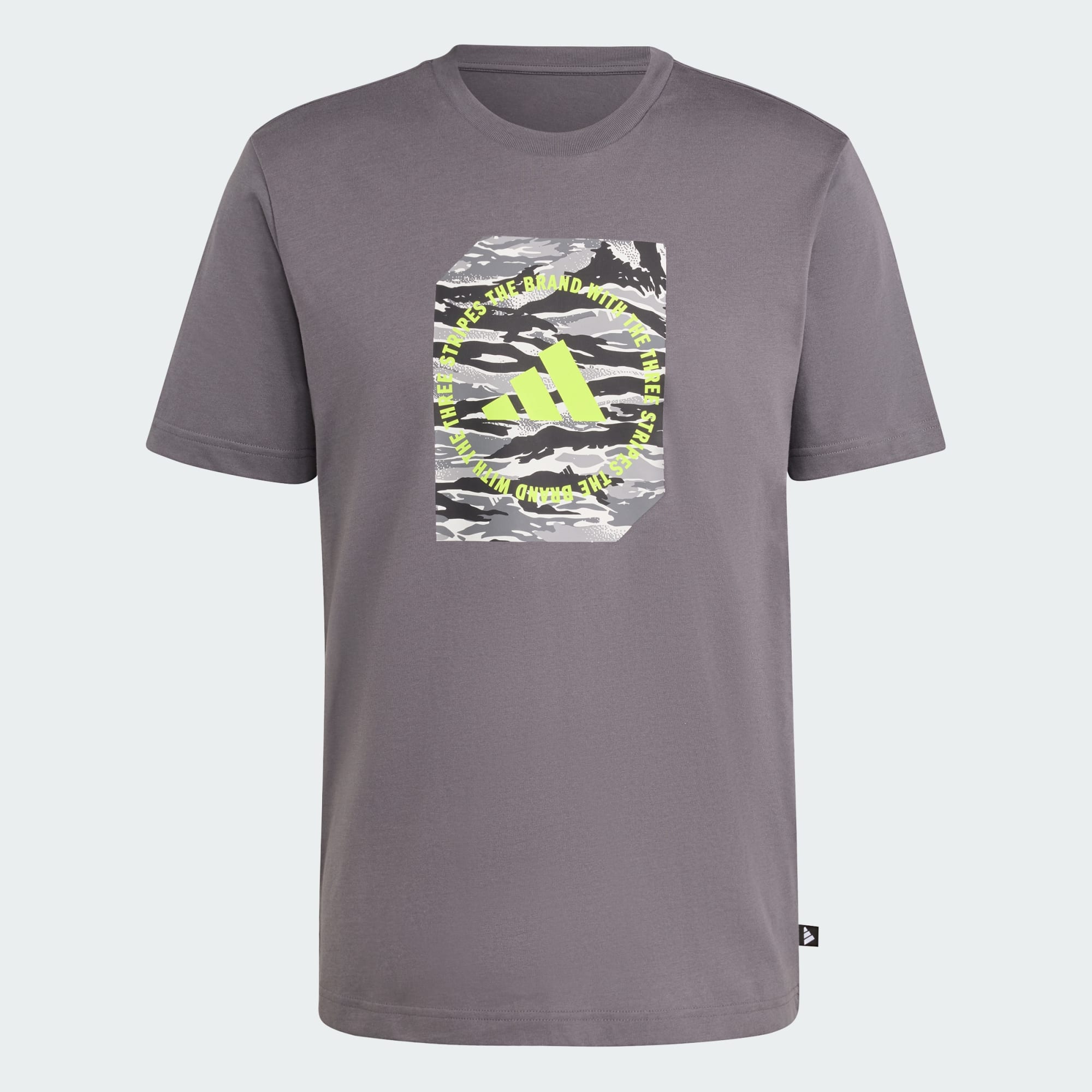 Life's an adventure. Celebrate the journey in this adidas graphic tee. Inspired by classic European camouflage, a bold, multicolour graphic stands out on the chest. Soft single jersey cotton keeps you comfortable no matter where the day takes you.