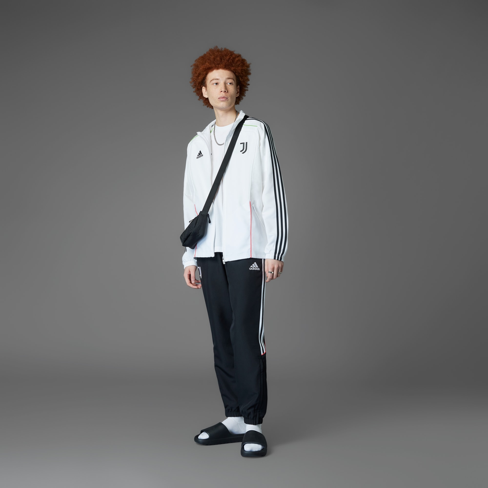 Juventus track pants showing 2010s football style, made with recycled materials.