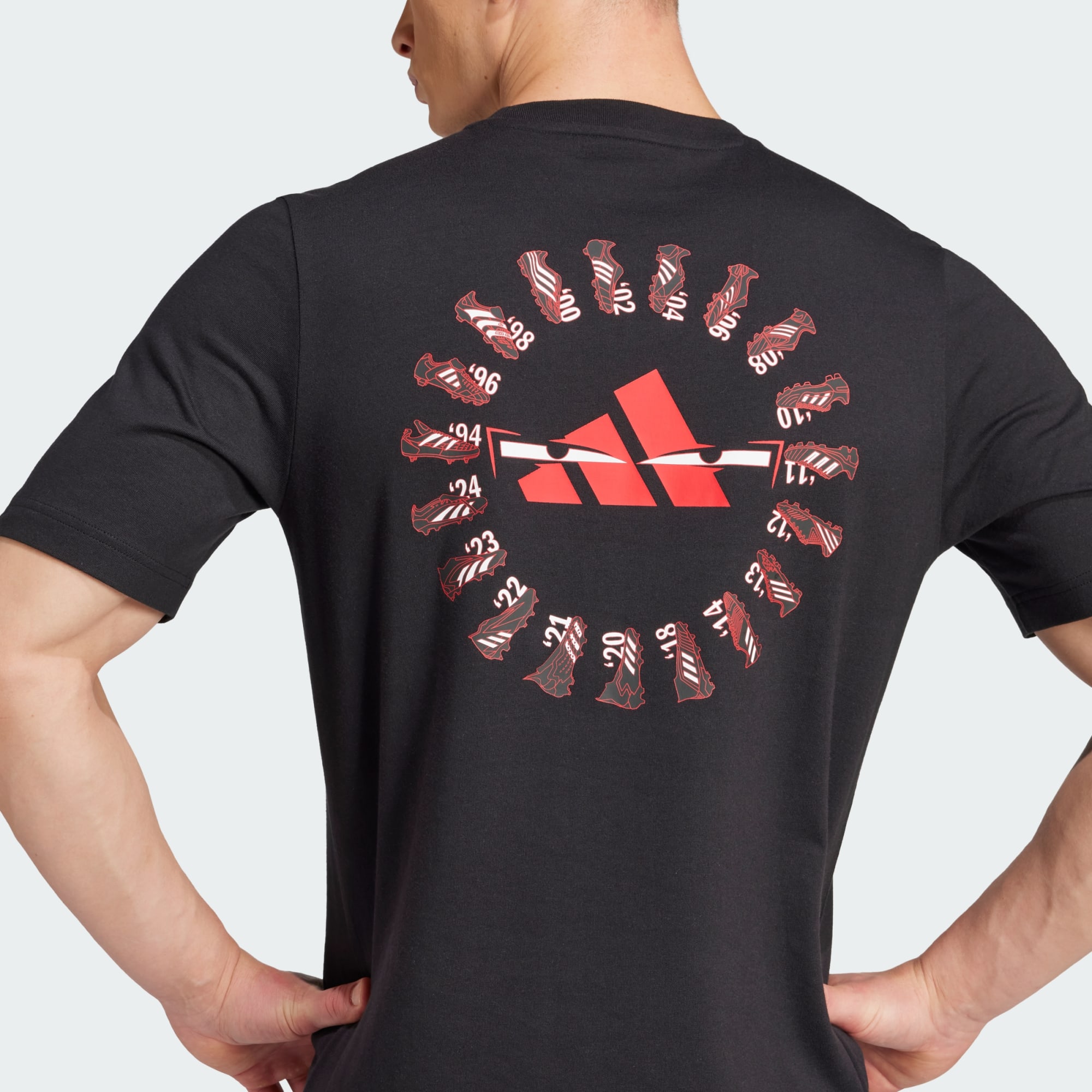Honour the iconic Predator's unmatched history every time you pull on this graphic tee from adidas. Soft single jersey fabric ensures you stay comfortable. That detailed print on the back includes profiles of every boot released since the iconic brand first launched in 1994.