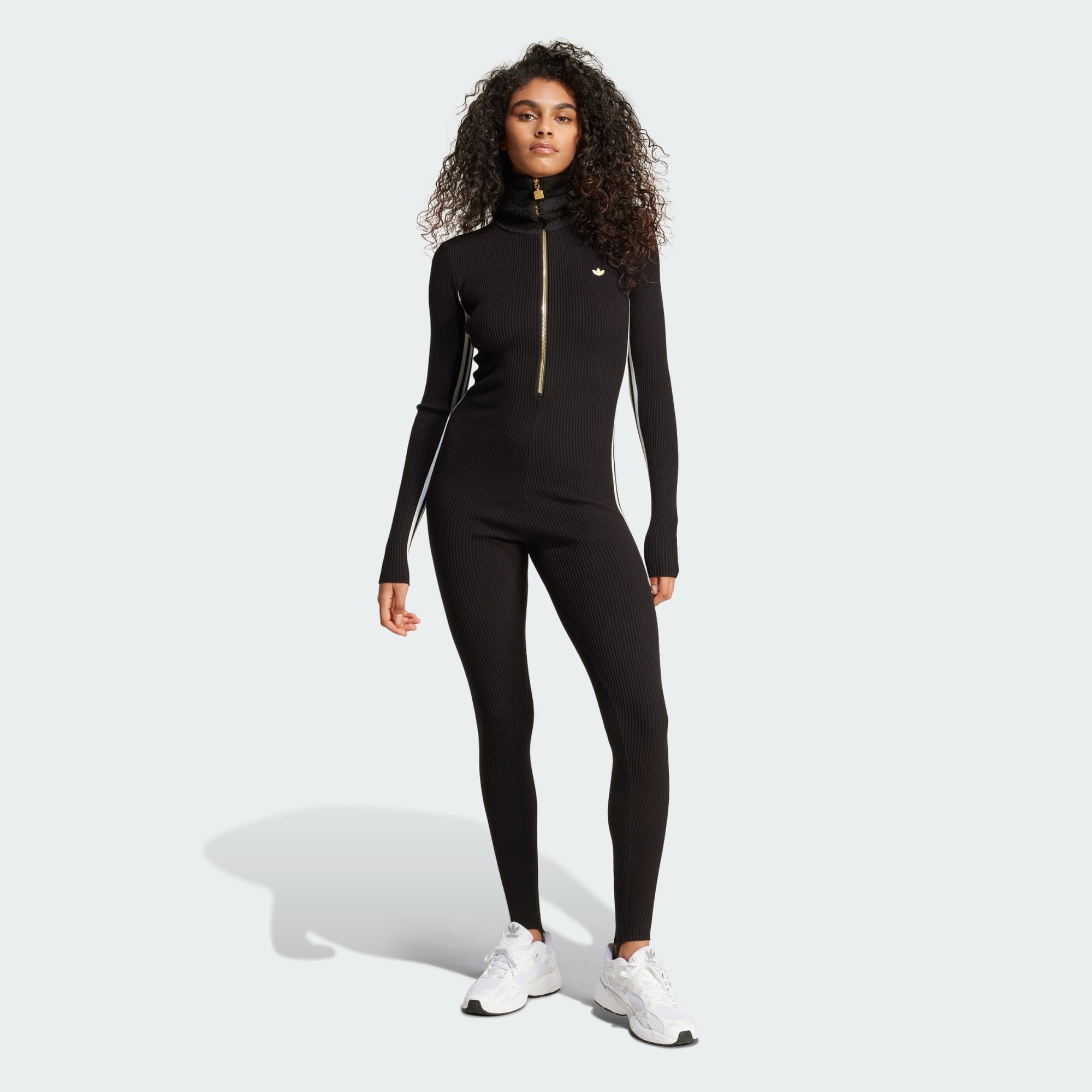 Premium knit with a slight stretch wraps you in indulgent softness in this lavish adidas jumpsuit. Pull it on and zip up the half zip — or don't — and feel it hug your body in a slim fit. An exaggerated collar adds extra drama, signing the look off with a dramatic statement.