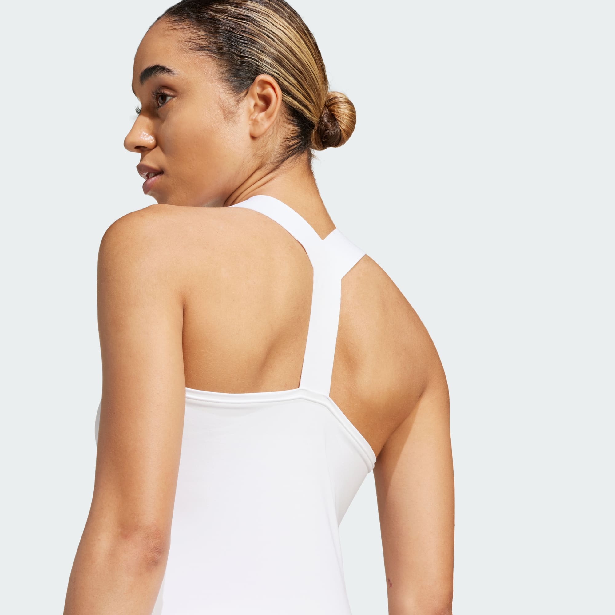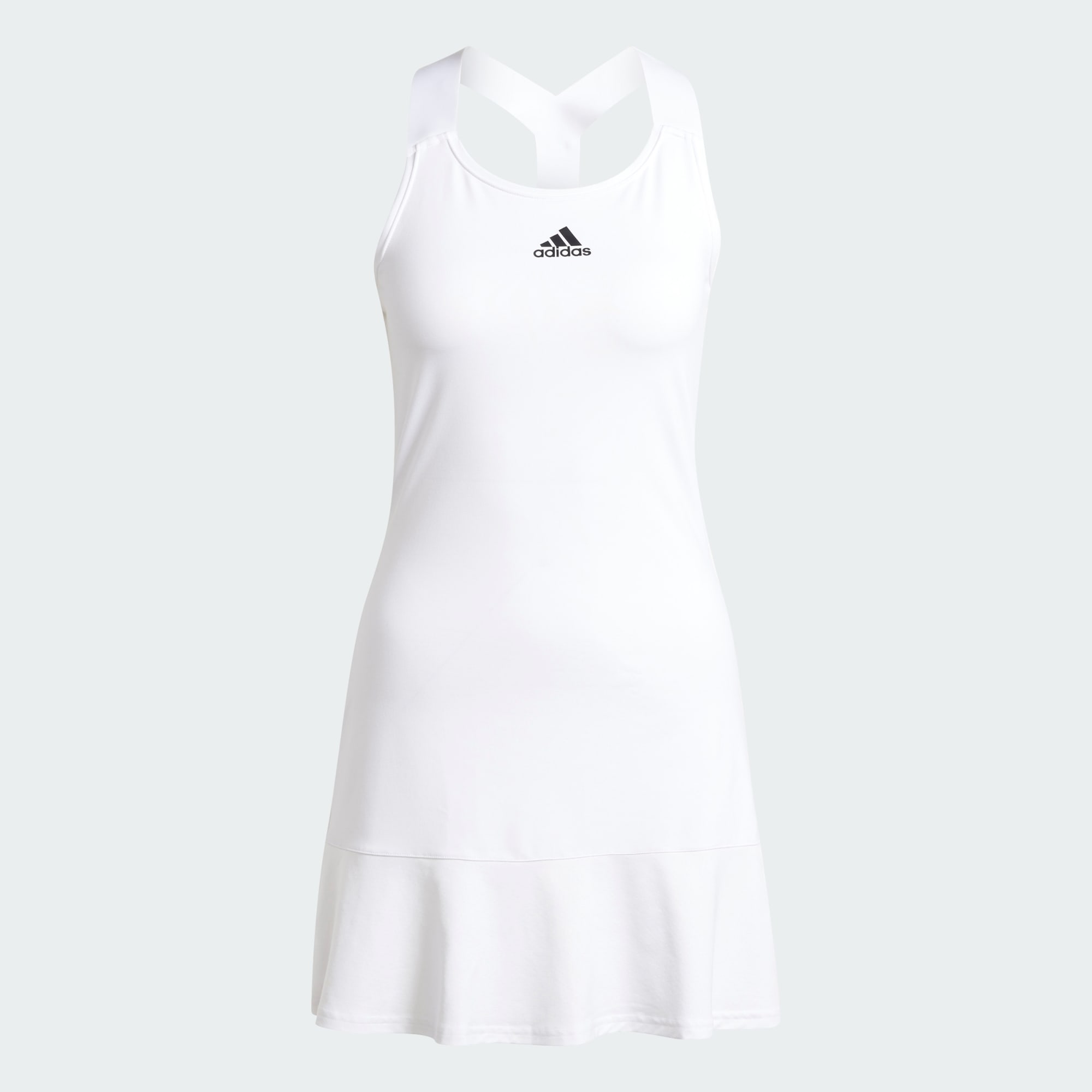 Created to help you own the court. The single-piece Y-shaped strap on this adidas tennis dress is precisely positioned to free your arms. Moisture-wicking AEROREADY and soft fabric that stretches with every lunge and slide combine to keep you in charge. Snug at the top, this dress flares into a flattering A-shape, while separate short tights give you full coverage.This product is made with Primegreen, a series of high-performance recycled materials.