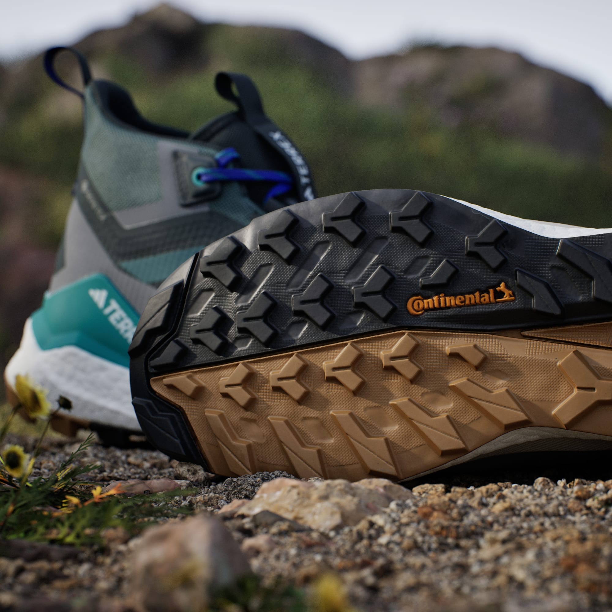 Hike further. Explore more. Enjoy the view. From thru-hikes to weekend explorations, these lightweight hiking shoes offer next-level comfort and support to extend your range in the mountains. A BOOST midsole brings energy to every step to keep you moving on hikes long and short. A GORE-TEX membrane seals out wet conditions while letting your feet breathe as they warm up. The soft, supportive upper and gusseted tongue hug your foot with form-fitting comfort that seals out debris and lets you hike longer. An internal frame and heel support add the stability to move with confidence over rocky terrain and uneven ground, and the Continental™ Rubber outsole maintains confident traction whether it's wet or dry. By choosing recycled, we are able to reuse materials that have already been created, which helps to reduce waste. Renewable materials choices will help us to remove our reliance on finite resources. Our products made with a blend of recycled and renewable materials feature at least 20% total of these materials.